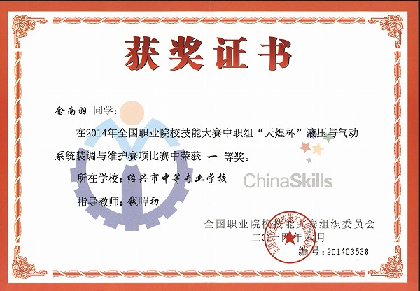 金南羽同学荣获2014年全国职业院校技能大赛中职组液压与气动系统装调与维护比赛项目一等奖