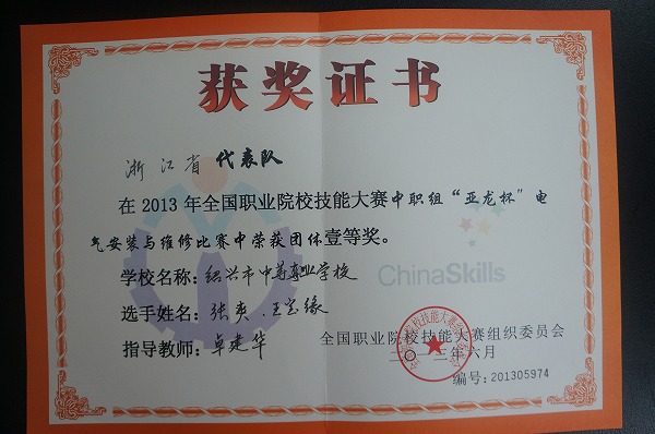 张爽、王宝缘同学荣获2013年全国职业院校技能大赛中职组电气安装与维修比赛一等奖