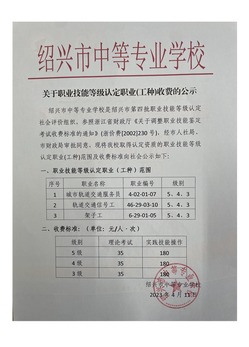 关于职业技能等级认定职业(工种)收费的公示