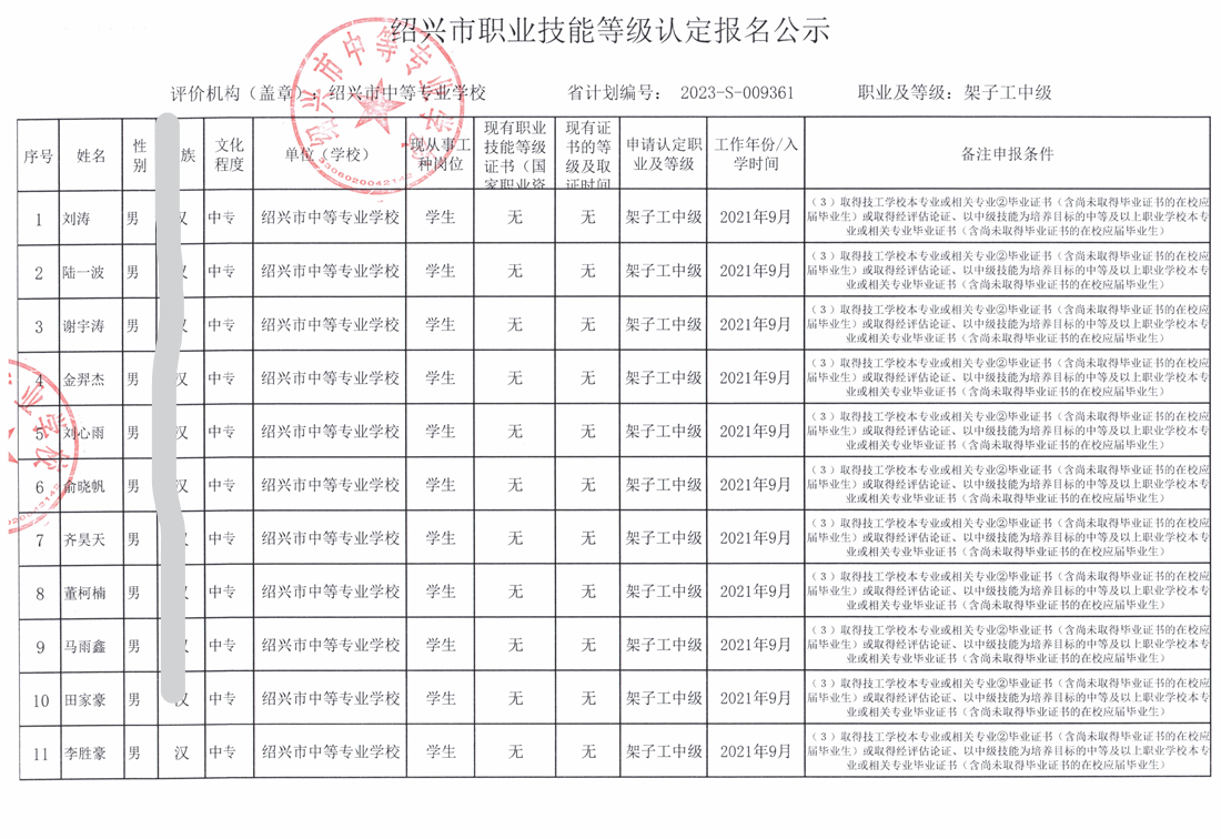 2023年开云网页版·官方版在线登入9月份架子工中级工报名公示