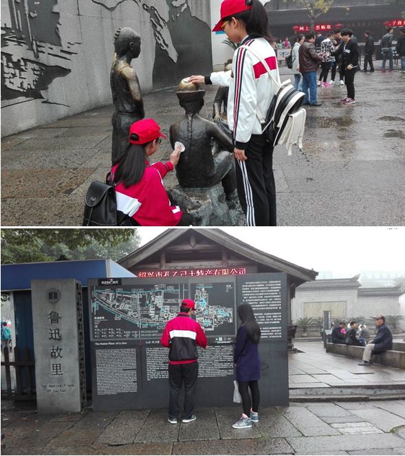 虽然是阴雨天,但是同学们志愿活动的热情却不减,有的同学向游客中心借来了清洁工具,开始清扫路上的果皮纸屑,一部分则用手捡起瓶瓶罐罐的放入可回收垃圾桶内;有的同学向游客分发我们事先准备的“攻略”,比如:‘公共厕所在什么位置,百草园、三味书屋的简介,哪家店铺的东西比较有特色……’;还有的同学站在景区地图讲解各个小景点位置分布,当游客有需要时就为他们带路。