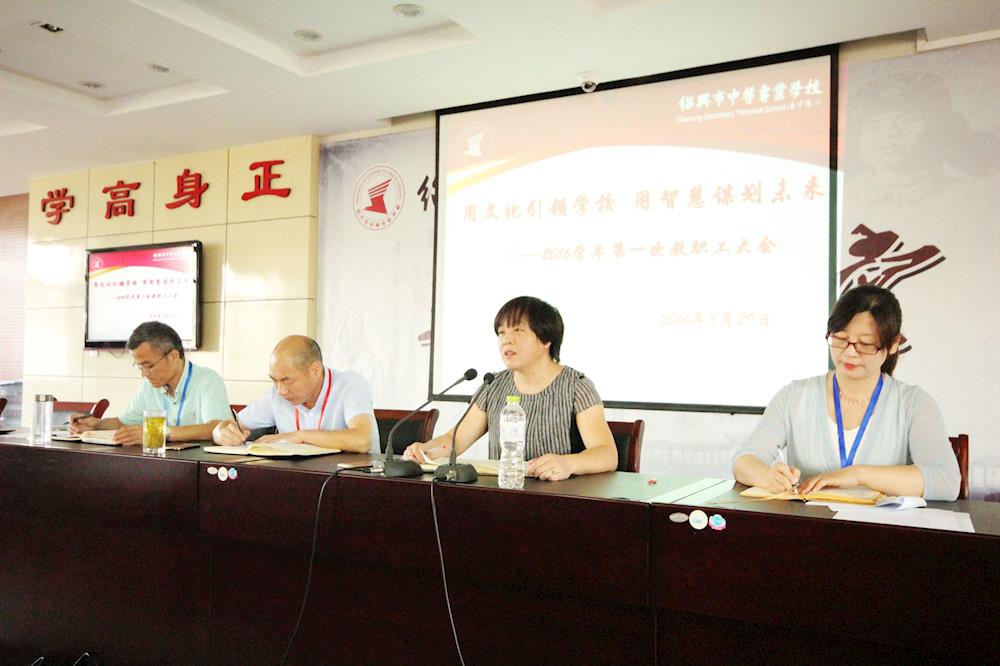 8月29日,绍兴中专隆重召开了2016学年第一学期的全校教职工大会,开启了新学期的新征程。2016年既是绍兴中专“十三五”规划建设的开局之年,又是学校实施“质量强校、文化兴校、特色亮校”战略,打造浙江省名校的关键之年。因此,此次大会既是学校“十三五”规划扬帆起航的誓师大会,又是打造浙江省名校战略启动的动员大会,对学校未来的发展具有非常重要的意义,注定在学校的校史上留下浓墨重彩的一笔。本次会议由校党委书记王慧莉主持,校长邵国成、副校长顾益明、於芳等校领导出席了本次大会,并作了重要讲话。