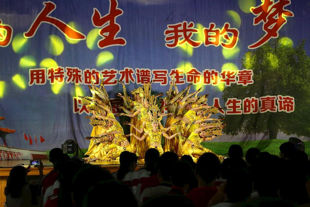 在2个小时的演出过程中,每一个节目都能够让现场师生或热血沸腾,或触动心灵。其中,没有双臂的书法家袁克西先生以口执笔,写下了“宁静致远”四个大字,其刚劲有力、笔走龙蛇的书法让现场师生惊叹不已。压轴舞蹈《千手观音》更是将整场演出推向高潮,聋哑姑娘们用精湛的舞姿将千手观音圣洁高雅、大爱慈悲的形象演绎得惟妙惟肖、美轮美奂,带给我们层出不穷、千变万化的视觉冲击力。整场演出掌声不断,学生与演员们的现场互动,让气氛十分热烈。