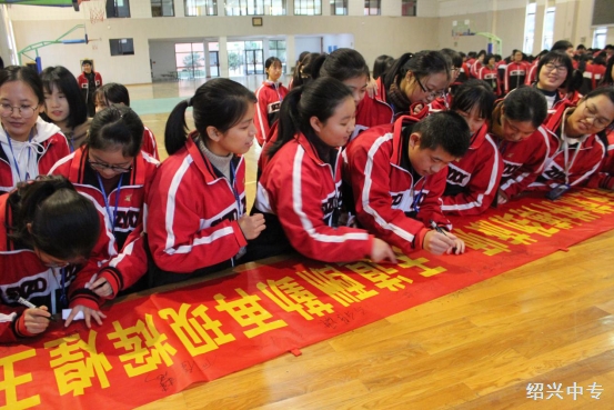 同学们在班级宣言横幅上签名